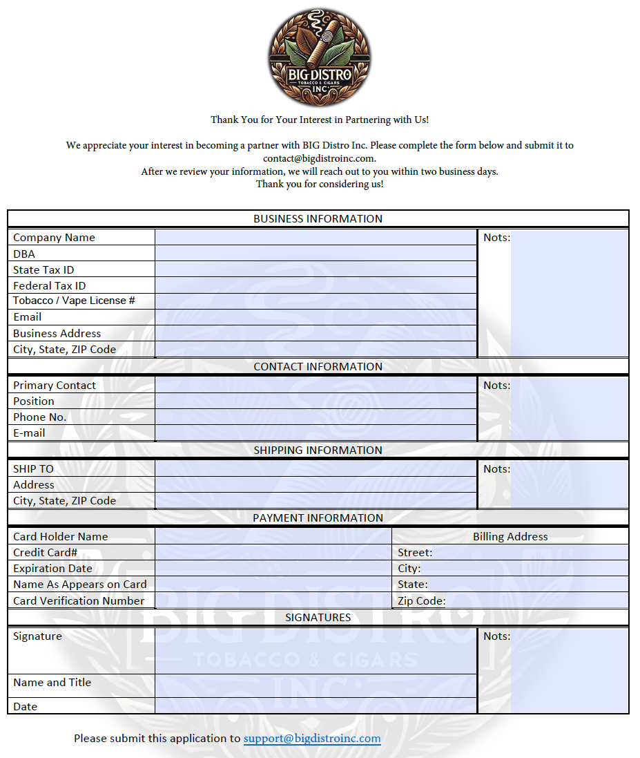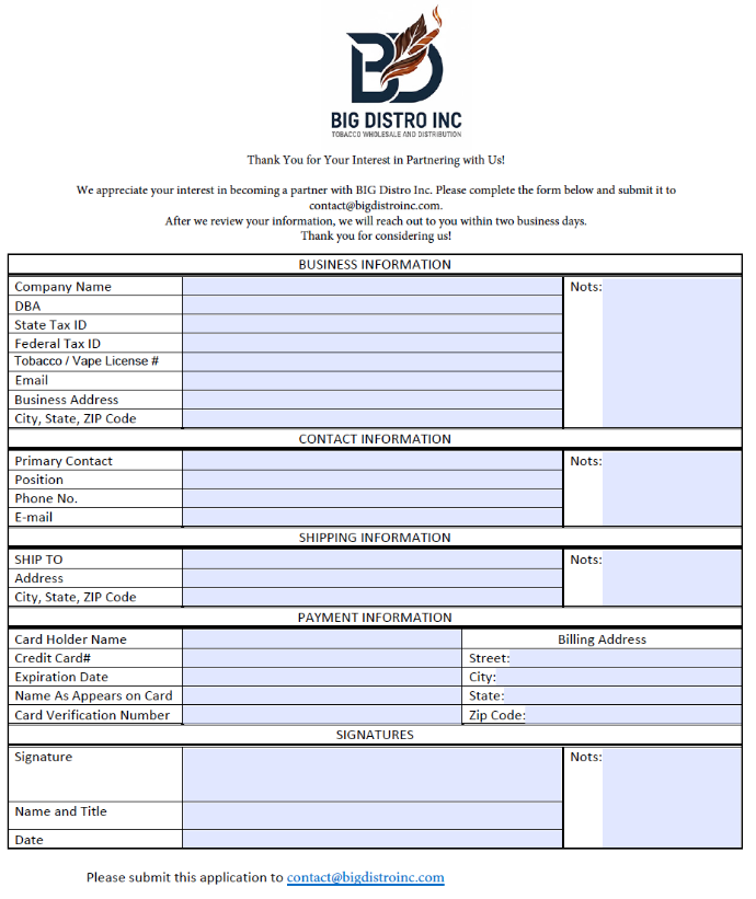 To register as a valued customer of Big Distro Inc., kindly follow the steps outlined below to complete your registration process: